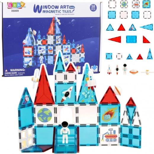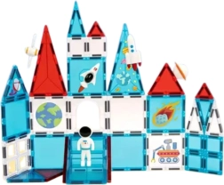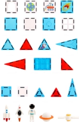 Odkrijte ustvarjalni svet z magnetnimi gradniki, navdihnjenimi z vesoljem. Močni magneti zagotavljajo stabilne konstrukcije, pisane oblike pa spodbujajo ustvarjalnost, logično razmišljanje in fino motoriko. Set 58 kosov z astronavtom, raketo in dekorativnimi ploščicami omogoča otrokom ustvarjanje fantastičnih vesoljskih baz in vozil.