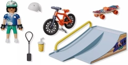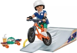 Ta darilni set PLAYMOBIL je idealen za male ljubitelje adrenalina. Figurica ima pametne prijeme na stopalih, zato trdno stoji na skejtu in na BMX kolesu – pripravljena na skoke in trike na trodelnI rampi. Odlične podrobnosti, kot so čelada ali kapa, slušalke z MP3 in pijača, ustvarjajo pristno vzdušje skejtparka.