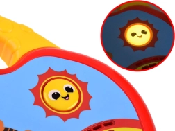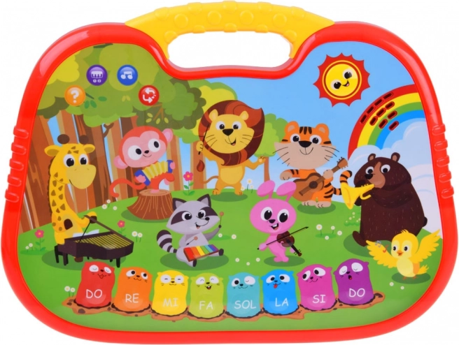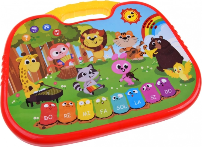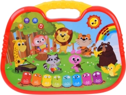 • Predvajanje melodij – vsak pritisk zaigra naslednji ton znane pesmice (npr. Old MacDonald, Twinkle Little Star). Izbiro skladbe menja rdeč gumb s puščicami.