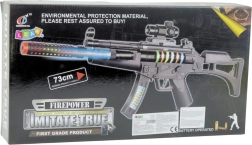 Ta otroška puška je izdelana iz kakovostne in trpežne plastike, ki prenese intenzivno igranje in je varna za otroke. Impozantna dolžina 73 cm poudari realističen videz in otrokom pričara občutek prave akcije. S pritiskom na sprožilec se aktivirajo svetlobni in zvočni učinki, ki naredijo igro še privlačnejšo.