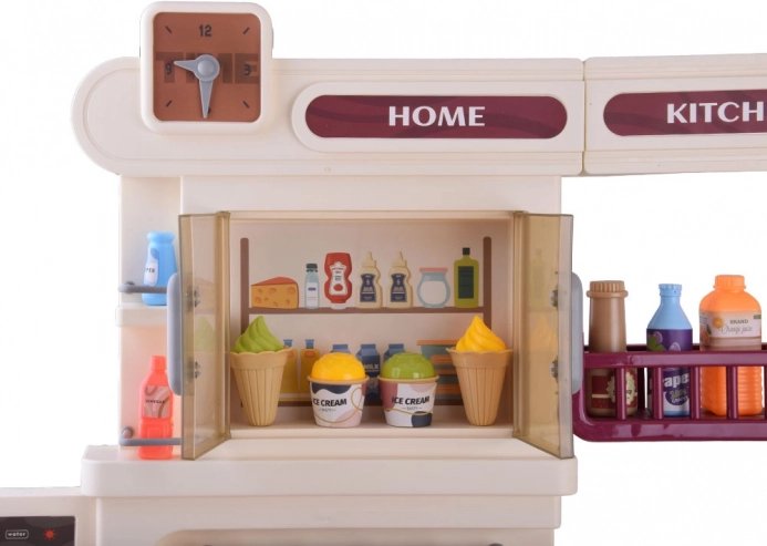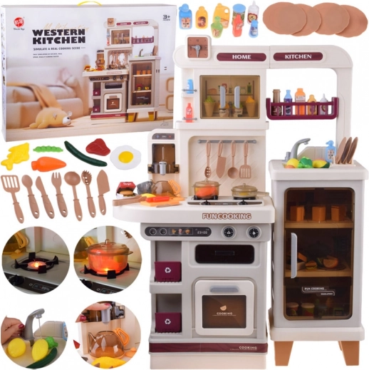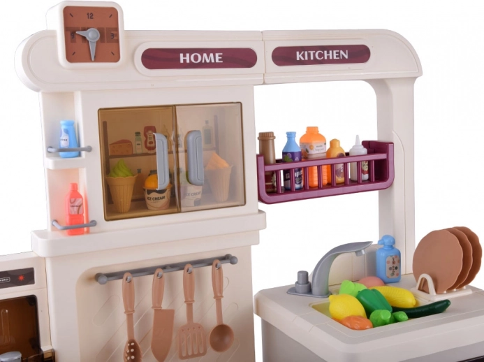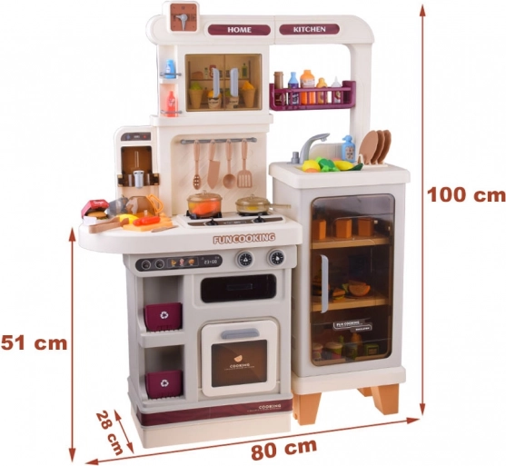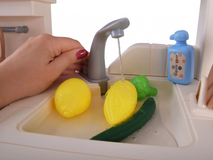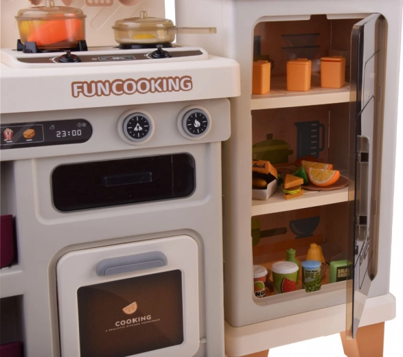 Velika plastična otroška kuhinjica v nežnih bež odtenkih spremeni vsako otroško sobo v kulinarični studio. Ponuja svetlobne in zvočne učinke, realističen kuhalnik s paro, odpirajoča se vratca pečice in omaric, delujočo ročno črpalko na pipo ter bogate dodatke za fantastično igro kuharjev.