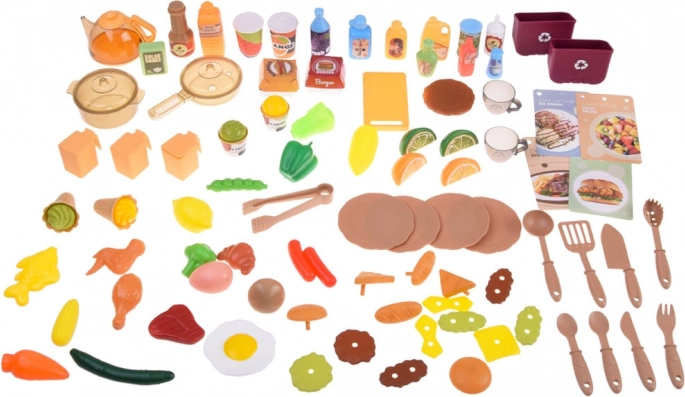 - lonec s pokrovko, ponev, čajnik, krožniki, skodelice, pribor, klešče, zajemalka, deska, solnice in stekleničke, kartice jedilnega menija, živila (sadje, zelenjava, jajce, goba, meso, riba, hamburger, steak), deli za sendvič/bageto/burger