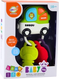 Interaktivni ključki za najmlajše združujejo svetlobne učinke, veselne zvoke, funkcijo ropotulje in mehko grizalo. Barvit daljinec v obliki avtomobilčka s tremi velikimi gumbi spodbuja fino motoriko, senzorični razvoj in zabava otroke doma in na poti.
