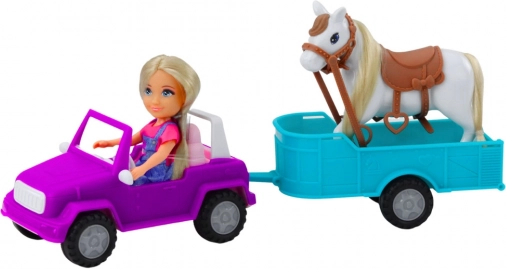 Ta barvit igralni set združuje ljubezen do vozil in živali. Terenski kabriolet s prikolico omogoča varen prevoz konjička na kmetijo ali na izlet, punčka v udobnih oblačilih pa dopolni vsako zgodbo. Vzdržljivi plastični materiali in premišljene podrobnosti zagotavljajo dolgo življenjsko dobo tudi pri vsakodnevni igri.