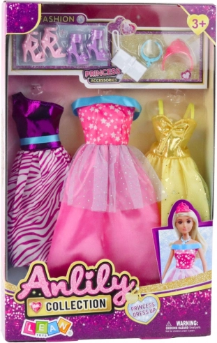 Stajliš set za male ljubiteljice mode: tri čudovite obleke in dodatki za punčke visoke približno 29–30 cm. Vsebuje zlate plesne obleke, rožnato tilasto obleko, obleko z živalskim vzorcem, dva para čevljev, torbico, krono in ogrlico. Zahvaljujoč preprostemu oblačenju razvija fino motoriko, kreativnost in domišljijo otroka.