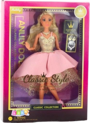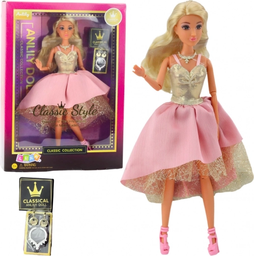 Ta očarljiva lutka v elegantni plesni obleki ponuja klasičen slog in dovršeno izdelavo – od skrbno sešite obleke z zlato čipko do realističnih obraznih potez. Idealna je za vsakodnevno igro in ustvarjanje lastnih zgodb.