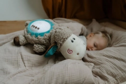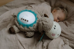 Ovčka sveti s prijetno toplo svetlobo ter predvaja melodije in nežne zvoke narave za mirno uspavanje brez stresa.