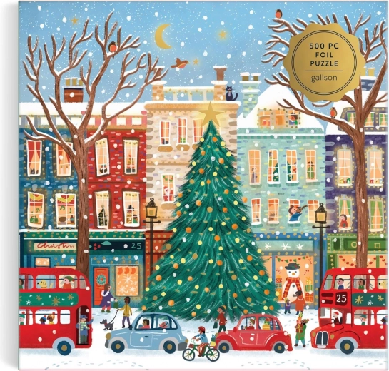 Kovinske kvadratne sestavljanke Okrašeno mesto, 500 koščkov. Predloga v paketu, dimenzije po sestavi pribl. 51 × 51 cm. Eleganten motiv s kovinskim učinkom.