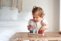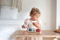 Lesena sestavljanka Cubika Pastel Razvrščanje oblik V prinaša učenje skozi igro. Otroci razvrščajo in natikajo 16 perforiranih geometrijskih oblik na količke pravokotne osnove, urijo koordinacijo oko–roka ter se učijo prepoznavati barve in oblike.
