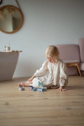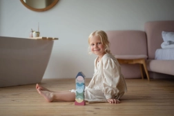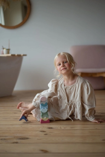 Ta pastelni balansirni stolp ponuja 11 natančno obdelanih lesenih delov, ki morajo pravilno sovpadati. Zahvaljujoč zaobljenim oblikam in premišljeni konstrukciji lahko stolp ne le postavljate navpično, temveč ga tudi varno nagibate na obe strani ter tako trenirate potrpežljivost in fino motoriko.