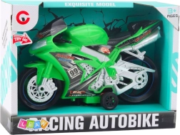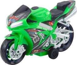 Ta zeleni dirkalni motor bo navdušil vse male ljubitelje hitrosti in motošportnih dirk. Izdelan je iz odolžljive plastike, ima stabilno stojalo in široka kolesa za zanesljivo vožnjo po različnih podlagah. Ob pritisku na gumb se sprožijo svetlobni učinki in realistični zvoki motorja, ki še okrepijo doživetje igre.