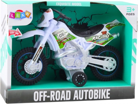 Bela motokros igrača s terenskimi kolesi, lučmi in zvoki. Vzdržljiva izdelava, realistična zasnova, baterije 3× AG13 v paketu. Odlična zabava za otroke.