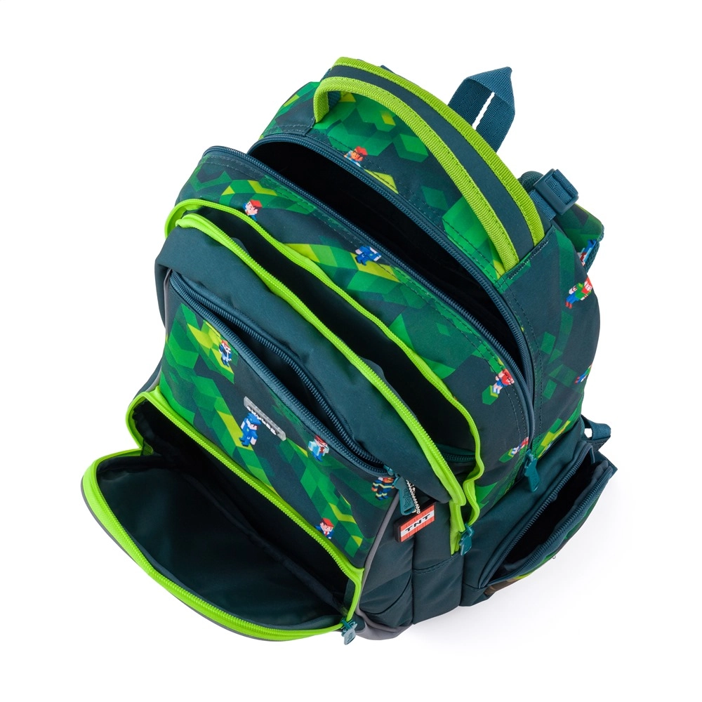 Notranjost ponuja dva prostorna notranja žepa za učbenike, zvezke in prostočasne stvari, ob straneh pa sta dva manjša žepa – eden odprt in eden na zadrgo. Trdno vodoodporno dno ščiti vsebino pred vlago in umazanijo, zato nahrbtnik dlje časa ostane kot nov. Zahvaljujoč odsevnim elementom je otrok bolje viden v mraku in dežju.