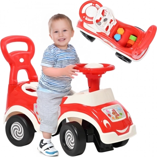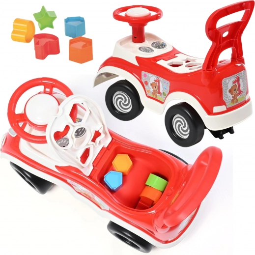 Ena igrača – štiri funkcije. Otrok vadi hojo z oporo, se poganja med vožnjo in se uči oblike z vgrajenim sortirnikom z barvnimi kockami.