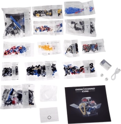 Sestavni del so oštevilčene vrečke za lažjo orientacijo, USB kabel za polnjenje in pregleden slikovni priročnik. Učinkovita rdeča svetloba modelu doda impresiven videz in poudari gibajoče se dele.