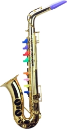 Otroški saksofon v elegantni zlati barvi z barvnimi tipkami pritegne na prvi pogled in odlično sede v roke. Mehanska izvedba brez baterij je varna, okolju prijazna in vedno pripravljena za igranje – dovolj je pihniti in pritisniti tipke.