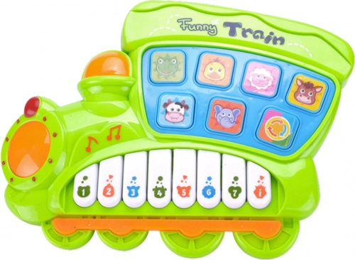 Zelen otroški klavirček v obliki lokomotive: 6 gumbov z živalmi, 8 notnih tipk, melodije in učinki. Varno in lahko, idealno od 18 mesecev.