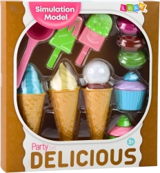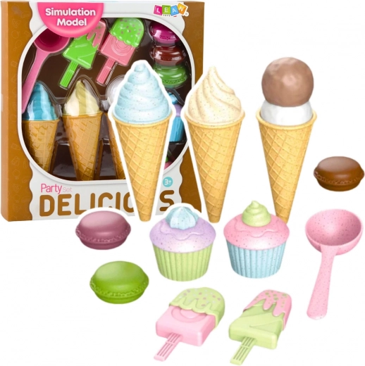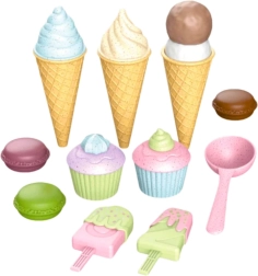 Barvit komplet sladoledov in sladic bo razveselil vse male slaščičarje. Vsebuje kornete, lučke, mafine, makrone in zajemalko – vse iz varne plastike. Spodbuja ustvarjalnost, fino motoriko in igranje vlog v slaščičarni ali sladoledarni.
