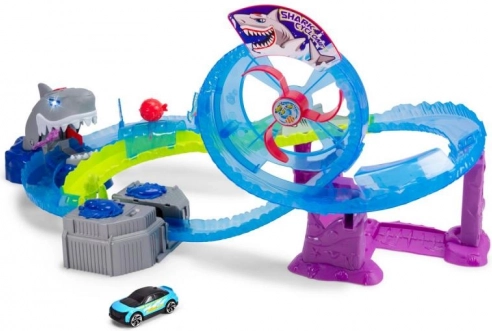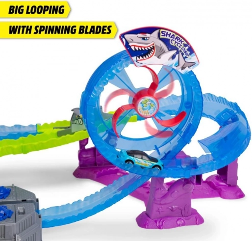 Uživajte v adrenalinski vožnji na motorizirani avtocesti s tematiko morskega psa. Avtomobili drvijo z največjo hitrostjo skozi zanko, prečkajo vodni tunel in lahko pristanejo tik ob ogromnem morskem psu – ta pa lahko kadarkoli zaskoči čeljusti! Vgrajen turbo pospeševalnik izstreli vozila na maksimalno hitrost in poskrbi za intenzivno dirkaško doživetje.