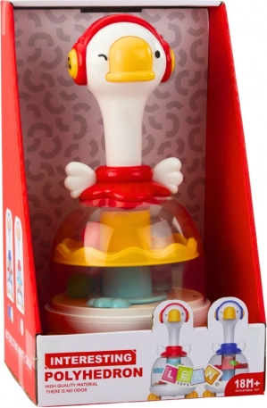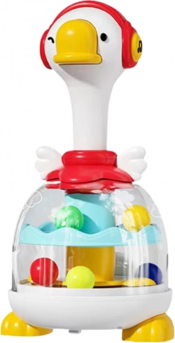 Ta zabavna in poučna igrača združuje preprosto upravljanje z bogatimi čutnimi dražljaji. S pritiskom na glavo gosi se sproži vrtilni mehanizem, ki požene barvite kroglice pod prozorno kupolo. Za dodatno privlačnost poskrbijo očarljivi svetlobni in zvočni efekti, ki zadržijo otrokovo pozornost in podpirajo njegovo naravno radovednost.