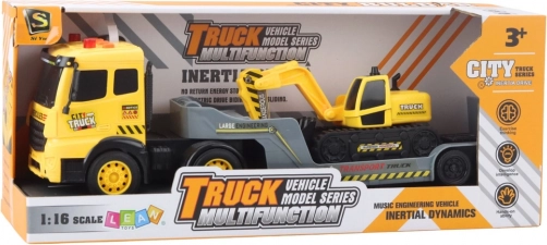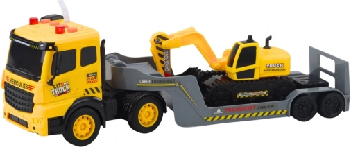 Ta podrobno izdelan gradbeni komplet združuje velik vlačilec z nizkopodnim priklopnikom in realističen gosenčni bager. Zahvaljujoč pogonu Friction Power je dovolj, da vozilo potisnete, in se samo zapelje, medtem ko osvetljeni učinki ter zvoki motorja, hupa in vzvratne vožnje igri dodajo pristnost. Preklopna zadnja rampa na priklopniku omogoča enostaven uvoz in izvoz strojev.