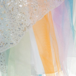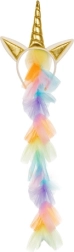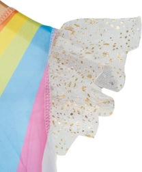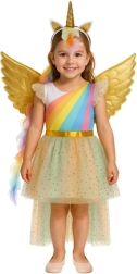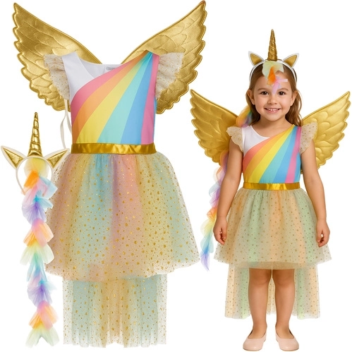 Čarobni komplet za male ljubiteljice domišljije vsebuje vse za hipno preobrazbo – bleščeče krilo z zvezdicami, zlata krila na elastikah in naglavni obroč z ušesi, grivo in rogom. Zaradi preprostega oblačenja čez glavo in elastičnih elementov je kostum hitro pripravljen na zabavo brez zapletenega zapenjanja.