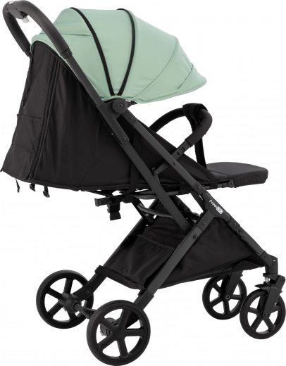 Varnost zagotavljajo 5-točkovni pasovi in zavora na zadnjih kolesih. Za enostavno ravnanje ne manjkajo odstranljiva kolesa in odstranljiv varnostni lok. Ročaj iz materiala EVA je prijeten na dotik in odporen. Prostran koš z nosilnostjo do 3 kg sprejme nakup ali opremo za pot.