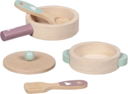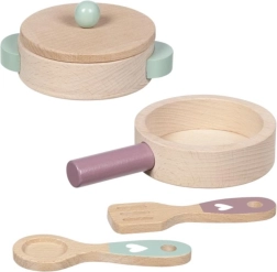 Ta leseni komplet za kuhanje bo navdušil vse male kuharje. Ponev in lonec s pokrovko sta izdelana iz odpornega bukovega lesa, ki prenese tudi vsakodnevne »kulinarične eksperimente«. Zahvaljujoč trdni izdelavi in gladkim robovom je igra varna in prijetna na dotik.