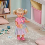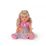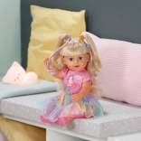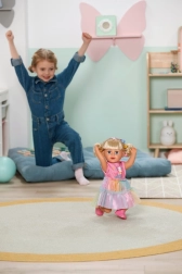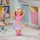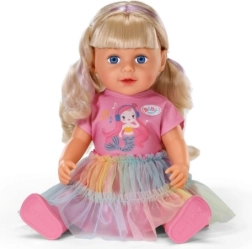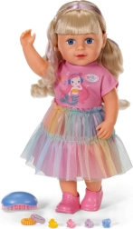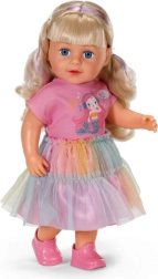 Odkrijte punčko BABY born Carla 43 cm z dolgimi kakovostnimi najlonskimi lasmi, ki se odlično češejo. Priloženih je 7 dodatkov za urejanje pričeske, punčka ima gibljive sklepe, zna stati sama in se zahvaljujoč čvrstemu telescu lahko kopa v kadi. Slog dopolnjujejo prisrčna majica, mavrično tilasto krilo in rožnati čevlji – popolno za ustvarjalno igro in oblikovanje pričesk.