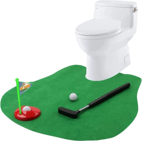Toaletni golf set spremeni vsak obisk stranišča v kratko sprostitev in trening natančne roke. Podloga realistično spominja na green, sestavljanje vzame le nekaj sekund, po igri pa jo preprosto zvijete in pospravite. Odlična ideja za rojstne dni, božič ali kot šaljivo darilo.