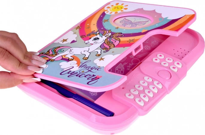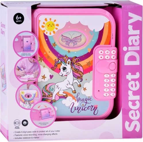 Odkrijte čarobnost lastnih skrivnosti z interaktivnim dnevnikom z motivom samoroga. Zahvaljujoč štirimestni kodi so vsi zapiski in malenkosti varno zaščiteni. Dnevnik ponuja 6 funkcijskih gumbov, snemanje in predvajanje glasu, spremembo glasu ter 10 vgrajenih melodij. Del kompleta so rožnata beležka, flomaster in skriti predalček za zaklade.
