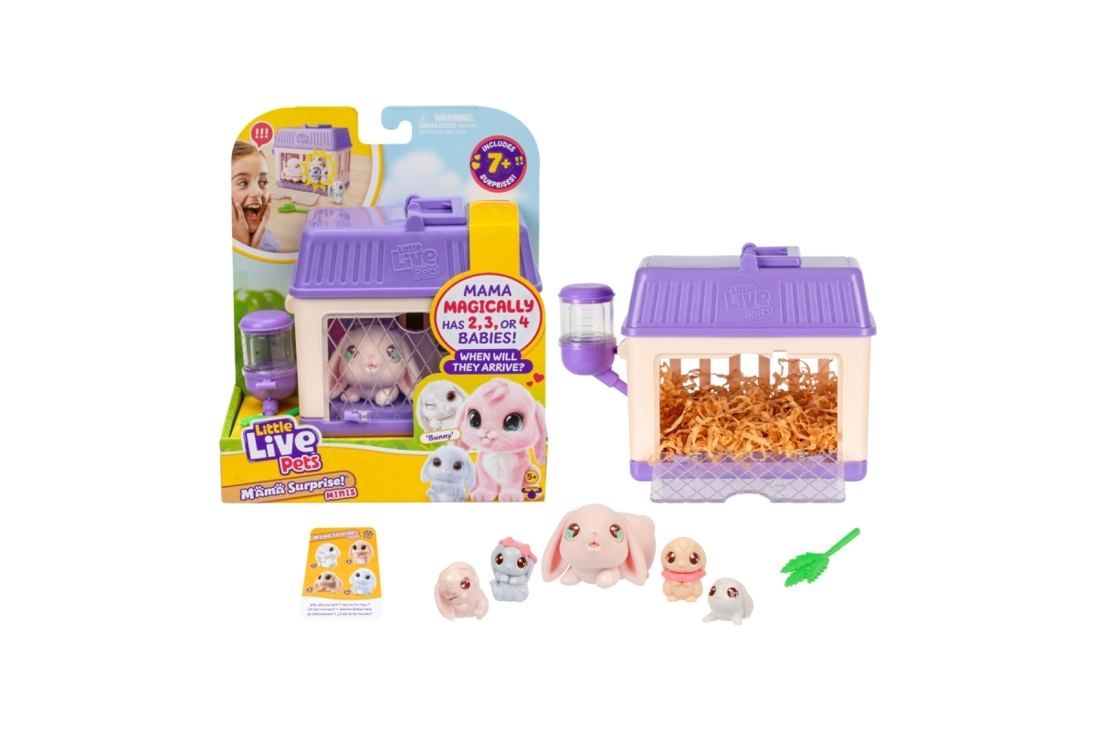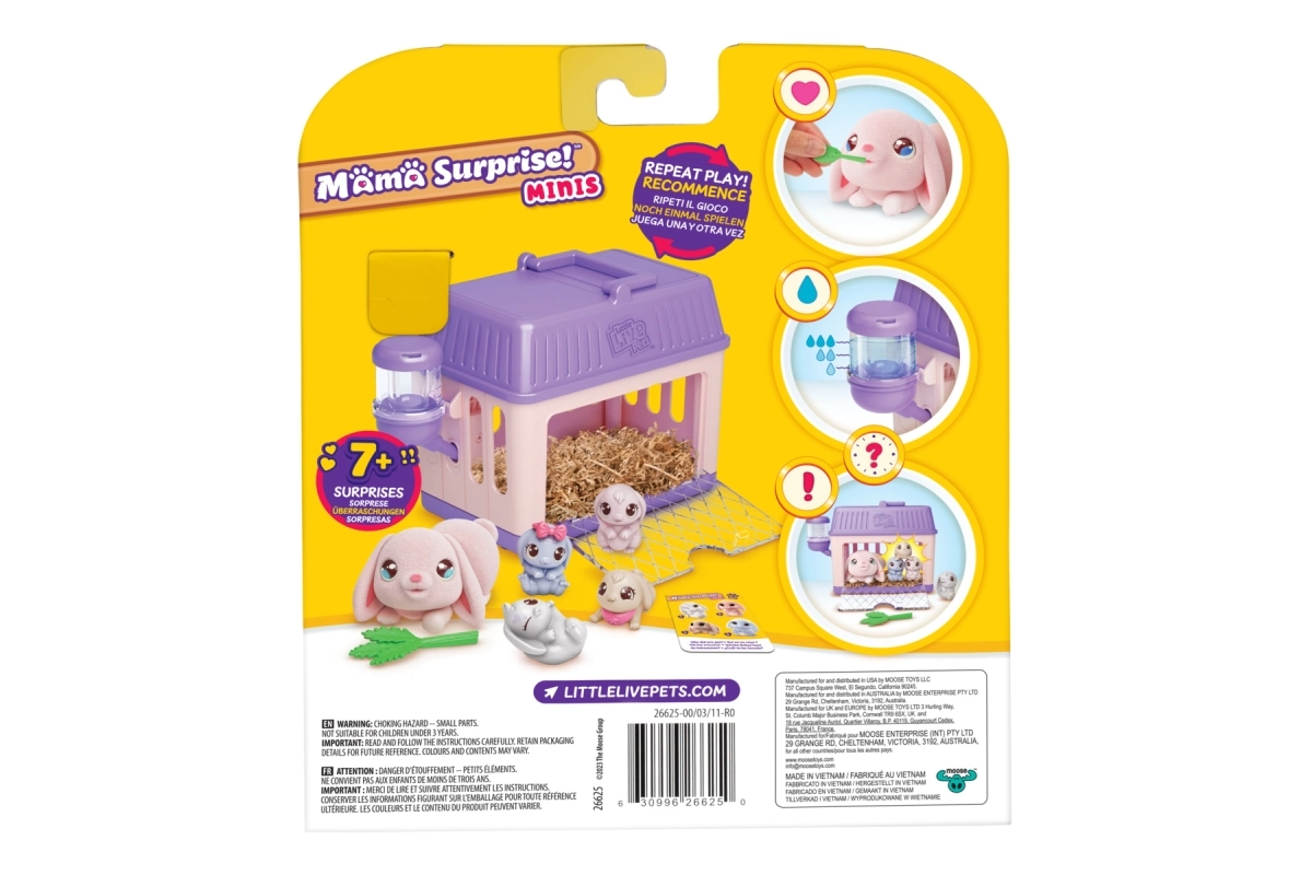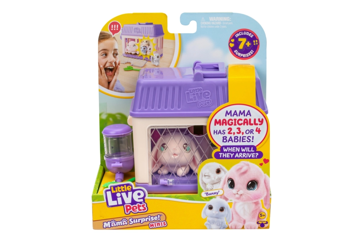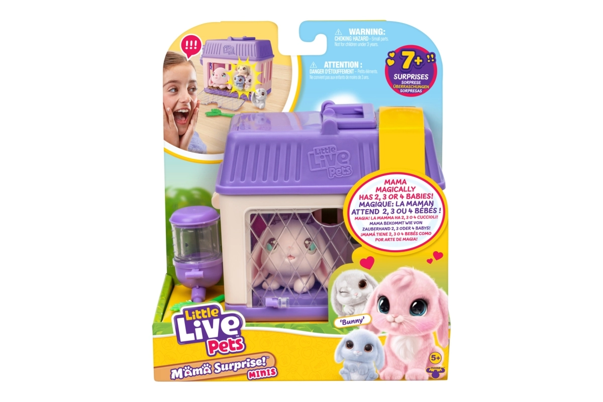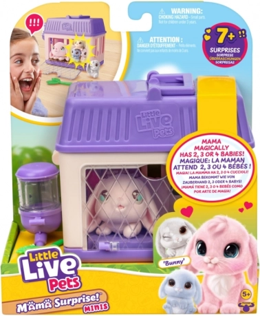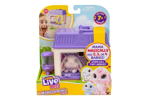Doživite čarovnijo z Little Live Pets – Mama Surprise! V pakiranju najdete interaktivno zajčjo mamico in 2, 3 ali 4 ljubke mladičke, ki se pojavijo po negi in ko napolnite napajalnik z vodo. Uživajte v do 7 presenečenjih, crkljanju, hranjenju in ponovnem igranju. Idealna zabava za otroke od 5 let.