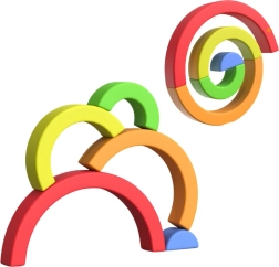 Zaradi petih različno velikih elementov lahko otroci sestavljajo ločne oblike, tunele in izvirne konstrukcije. Igrača pomaga razvijati fino motoriko, koordinacijo oko–roka in prostorsko predstavljivost – vse to popolnoma varno zahvaljujoč mehkem materialu brez ostrih robov.