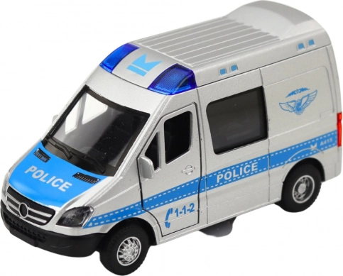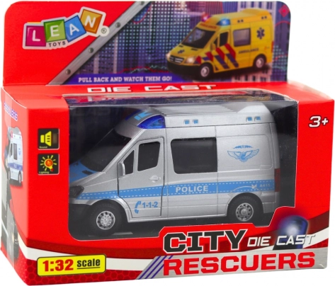 Verno izdelan policijski avto v merilu 1:32 združuje kovinsko karoserijo z odporno plastiko, zato je stabilen, varen in pripravljen na vsakodnevno akcijo. Avto samo povlecite nazaj in zahvaljujoč pogonu pull back bo sam speljal naprej. Odpirajoča se vrata okrepijo realističen doživljaj igre, medtem ko luči in zvoki vsaki intervenciji dodajo pravo vzdušje.