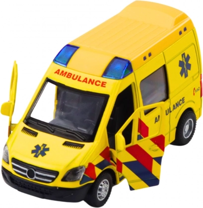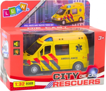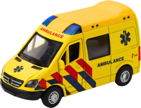 Realistično kovinsko reševalno vozilo v merilu 1:32 združuje trpežno izdelavo, pogon pull-back ter svetlobne in zvočne učinke. Rumena izvedba z napisom »Ambulance«, odpirajočimi se vrati in kompaktne mere ga delajo odlično igračo za male reševalce in zbiratelje.
