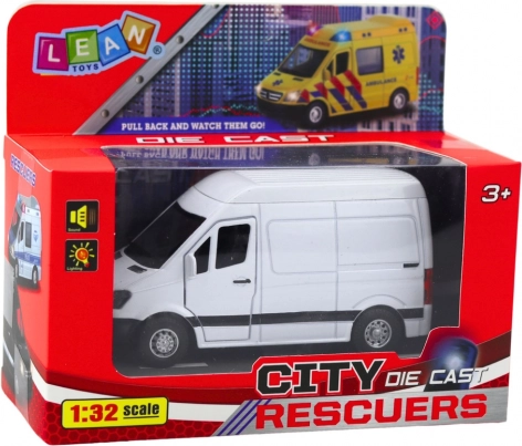 Realistično kovinsko dostavno vozilo v merilu 1:32 bo navdušilo male in velike navdušence. Ponuja navijalni pull back pogon, odpirajoča se vrata ter svetlobne in zvočne učinke. Kakovostna kombinacija kovine in plastike zagotavlja vzdržljivost, bel minimalističen dizajn pa se poda vsaki zbirki modelov.