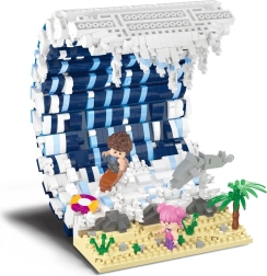 Model združuje podrobnosti, kot so mogočen vodni val, deskar na deski, igrivi delfin in peščena plaža s palmo. Ne manjkajo dve minifigurici, ki prizoru dodata zgodbo in akcijo – idealno za igro ali kot dekoracija.