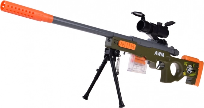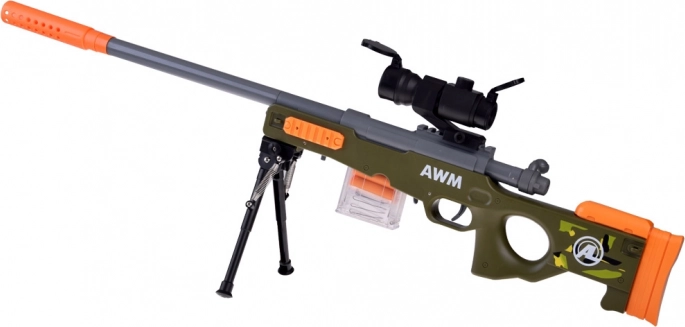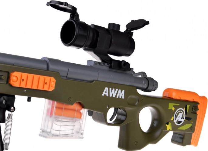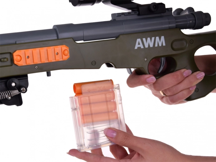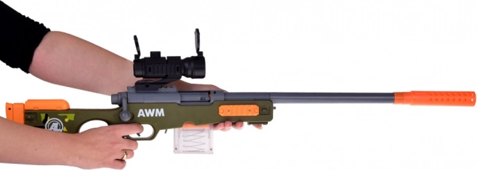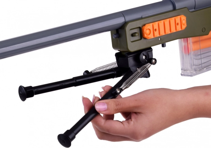Velika otroška ostrostrelniška puška na penaste naboje z optiko, nabojnikom in izmetavanjem »tulcev«. Lahka, brez baterij, varna in zabavna igra za otroke.