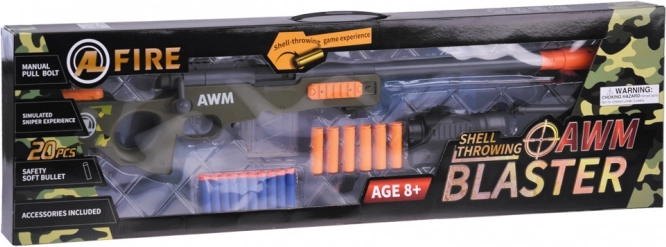 Velika otroška ostrostrelniška puška na penaste naboje prinaša impresivno realistično izkušnjo. Po vsakem repetirju iz komore izleti »tulec« kot pri pravi orožju, kar igri doda pristnost. Puška je v celoti iz plastike, zato je zelo lahka in udobna za držanje, otroci pa lahko uživajo v zabavi ure in ure.