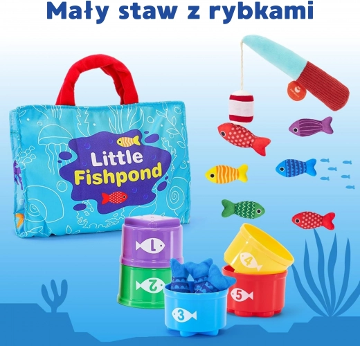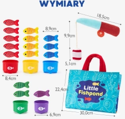 Igralni komplet WOOPIE za male ribiče je mehak, varen in privlačen pripomoček za otroke od 6 mesecev naprej. Barvite plišaste ribice, lahek ribiški prut z vabo na ježka, lončki–razvrščevalniki s številkami in zložljiva torba–podloga spremenijo vsak kotiček v mini ribnik. Otrok lovi ribice, jih razvršča v lončke ter se uči barv, štetja in vzorcev, hkrati pa razvija fino motoriko in koordinacijo.
