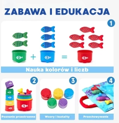 - Učenje skozi igro: razvrščanje ribic v oštevilčene lončke razvija štetje in prepoznavanje barv.