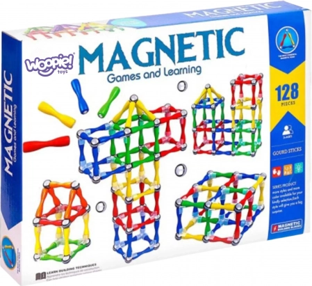 Magnetna gradbenica Woopie 3D, 128 delov. Močni magneti, varni materiali, 2D/3D konstrukcije, razvoj kreativnosti in logike. Za otroke od 3 let.