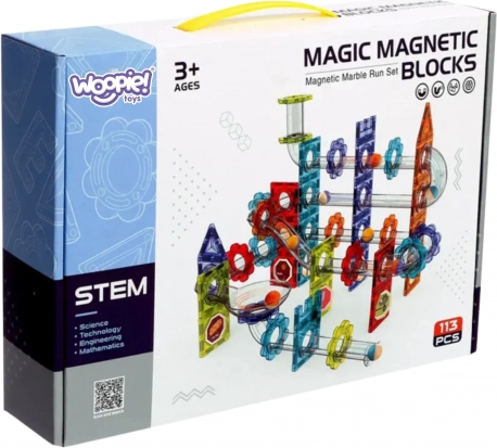 Odkrijte svet ustvarjalnosti z magnetno 3D sestavljanko WOOPIE s 113 deli, ki združuje kroglično stezo in prostorske gradnje. Prosojne magnetne ploščice in pisani elementi zagotavljajo ure zabave, razvijajo logično razmišljanje, prostorsko predstavo in fino motoriko ter hkrati učijo osnove fizike in gravitacije.