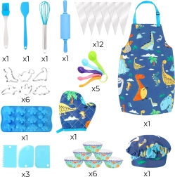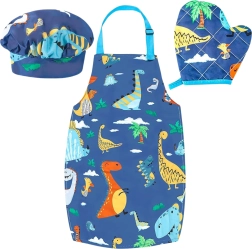Razvijte otroško domišljijo v kuhinji s prikupnim dino motivom. Set je izdelan iz kakovostnih in za živila varnih materialov, silikonske komponente se zlahka čistijo, predpasnik in kapo pa lahko perete v pralnem stroju. Zahvaljujoč nastavljivemu pasu in elastičnemu traku odlično pristaja otrokom različnih starosti.