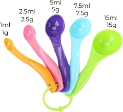 - 5 merilnih žličk, 6 modelčkov za izrezovanje, 12 slaščičarskih vrečk
