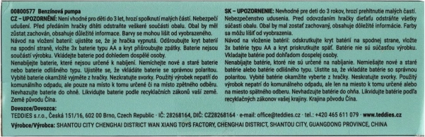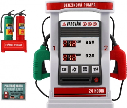Del kompleta so dve točilni cevi, plačilna kartica, gasilna oprema in drugi dodatki, ki ustvarjajo realistično okolje bencinske črpalke. Kompaktna embalaža je idealna za igro doma ali na poti.