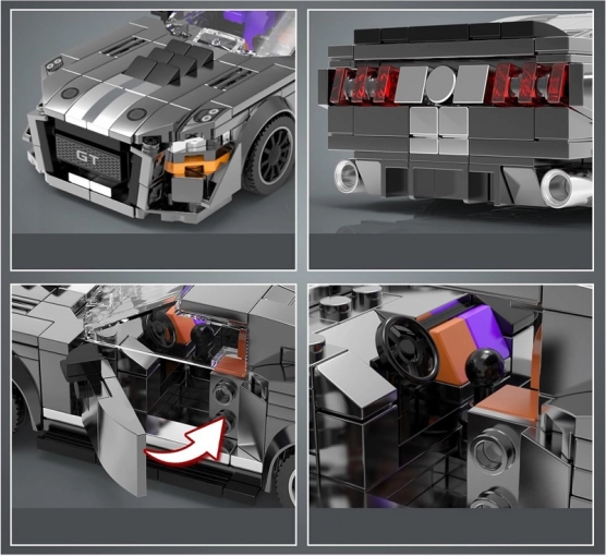 Ta tehnični set bo navdušil ljubitelje klasične ameriške motorizacije. Model, navdihnjen z legendarnim GT iz šestdesetih let, izstopa z muskulozno karoserijo, nizkim profilom in izrazitimi koloteki, ki mu dajejo dirkaški značaj. Dve beli črti, speljani od pokrova motorja prek strehe do zadka, poudarjata avtentičen dirkaški slog.