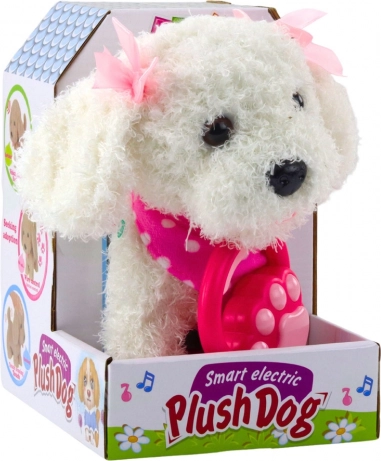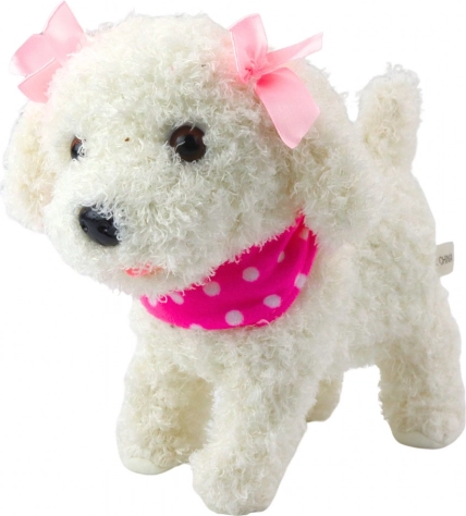 Ta interaktivni kužek iz prijetnega, mehkega pliša je odličen za crkljanje in igro vlog. Zahvaljujoč priloženemu povodcu v obliki tačke lahko kužka peljete na »sprehod«, kjer bo korakal in oddajal zvoke kot pravo pasje mladiče. Rožnat šal s pikami in ljubki trakci igrački dodajo čaroben videz.
