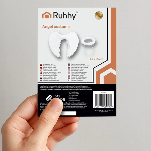 Praktični elastični trakovi zagotavljajo stabilno in udobno nošenje tudi med daljšimi dogodki. Komplet kril in avreole takoj dopolni kostum ter služi tudi kot stilska dekoracija – obesite jih na steno, naslonjalo stola ali jih uporabite v scenografiji.