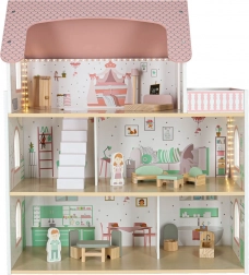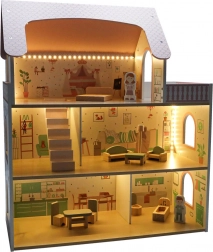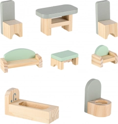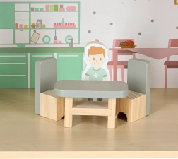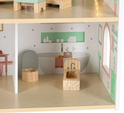 Vključeni so postelja, omarica, sedežna garnitura, miza s stoli ter kopalniška oprema. Dve leseni figurici spodbujata domišljijsko in igranje vlog.